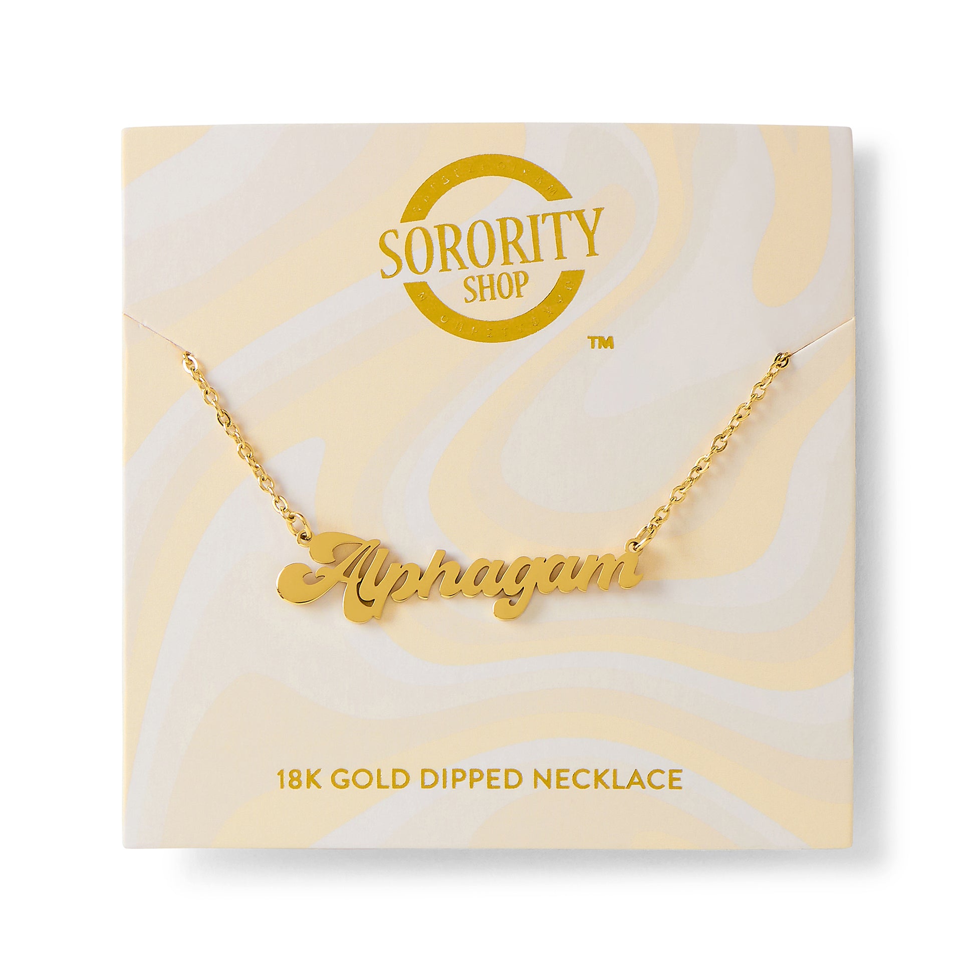 The perfect gift of Sisterhood! Our Sorority Sisterhood Retro Necklace features your sorority name or nickname dipped in 18k gold! This necklace comes with a perfectly giftable backer card with gold foil printing. Perfect for gifting. Perfect for a bid day gift, big little gift or a treat for yourself!