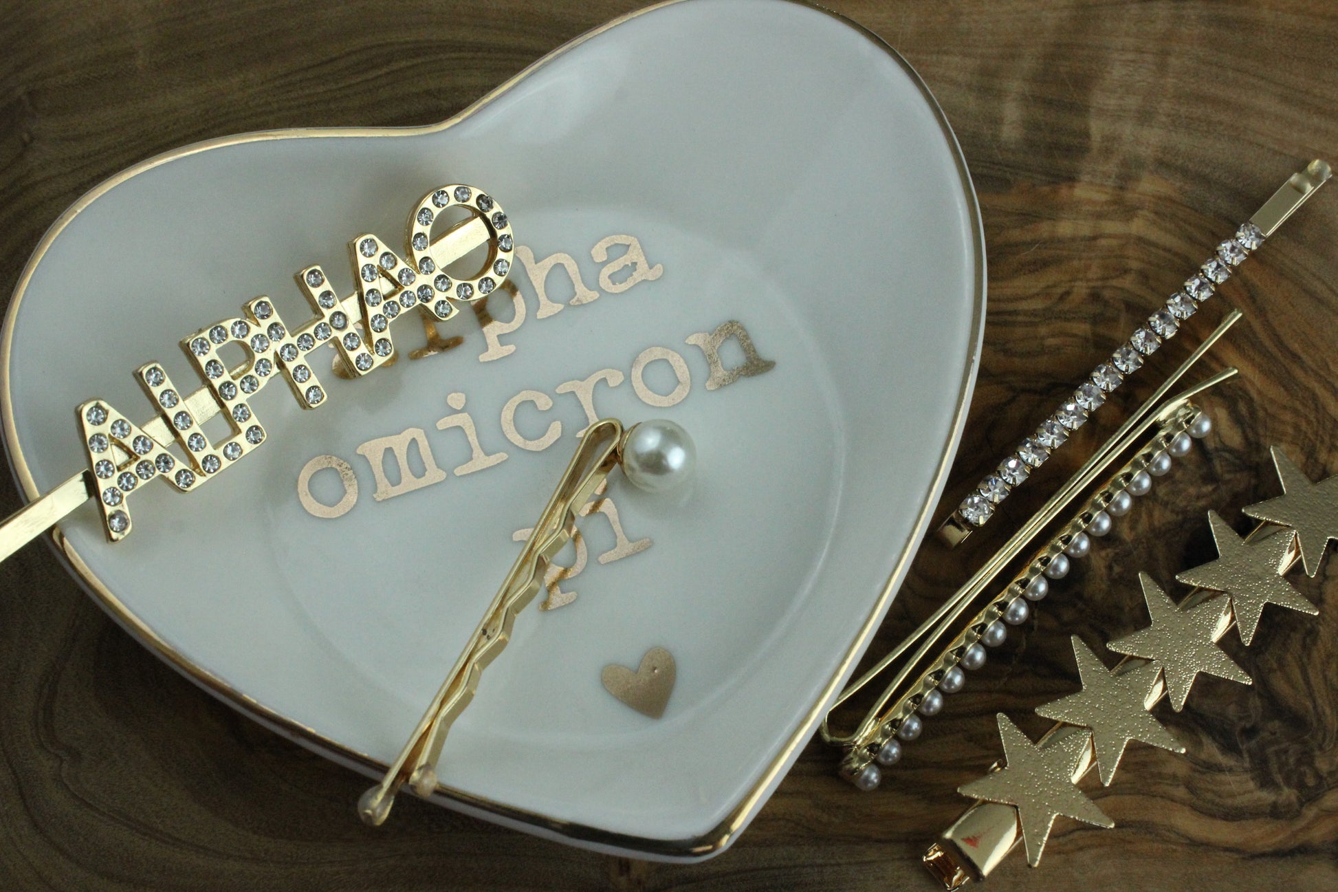 Our Alpha Omicron Pi ceramic ring dish is the definition of chic with its high gloss finish and sorority name, heart and edge in gold. Great for rings, jewelry, keys or trinkets. Perfect for home or office!