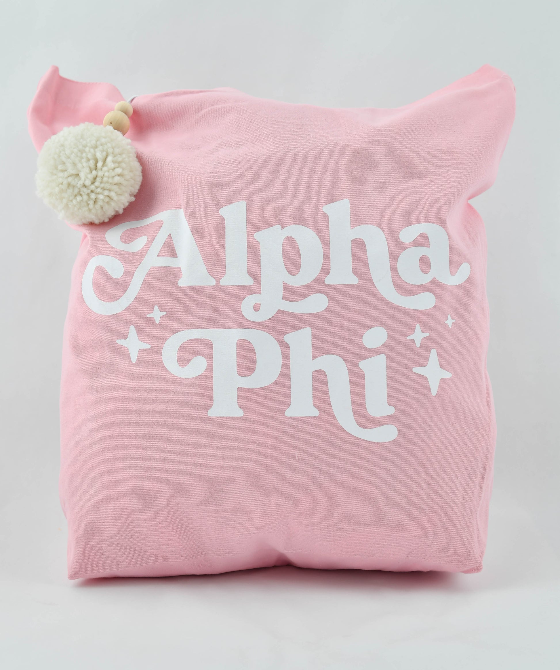 Represent your sorority spirit with our Retro Pom Pom Tote Bag! Perfect for carrying books, as a laptop bag, beach carry-all, or even an everyday purse! Our tote is made in the color of your organization, features a super trendy retro script, and even includes a fluffy yarn pom pom with wooden bead detail.