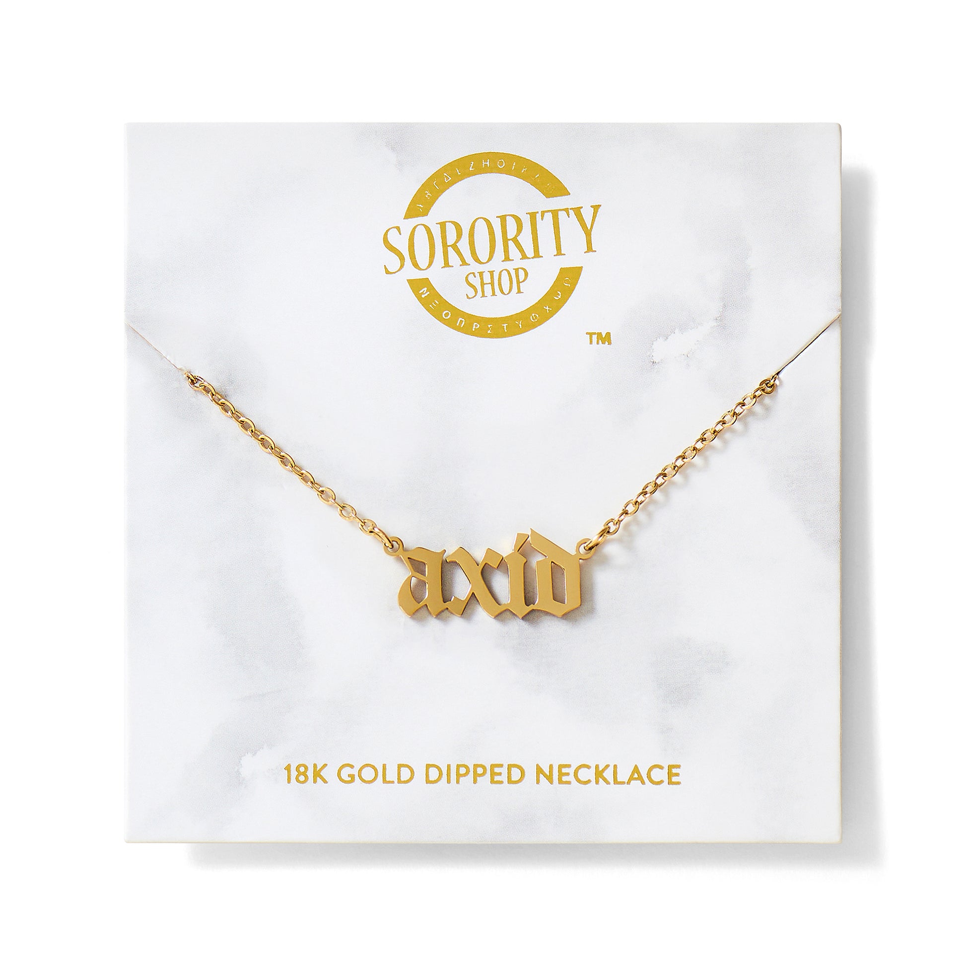 The perfect gift of Sisterhood! Our Sorority Sisterhood Old English necklace features your sorority name or nickname dipped in 18k gold! This necklace comes with a perfectly giftable backer card with gold foil printing. Perfect for gifting. Perfect for a bid day gift, big little gift or a treat for yourself!