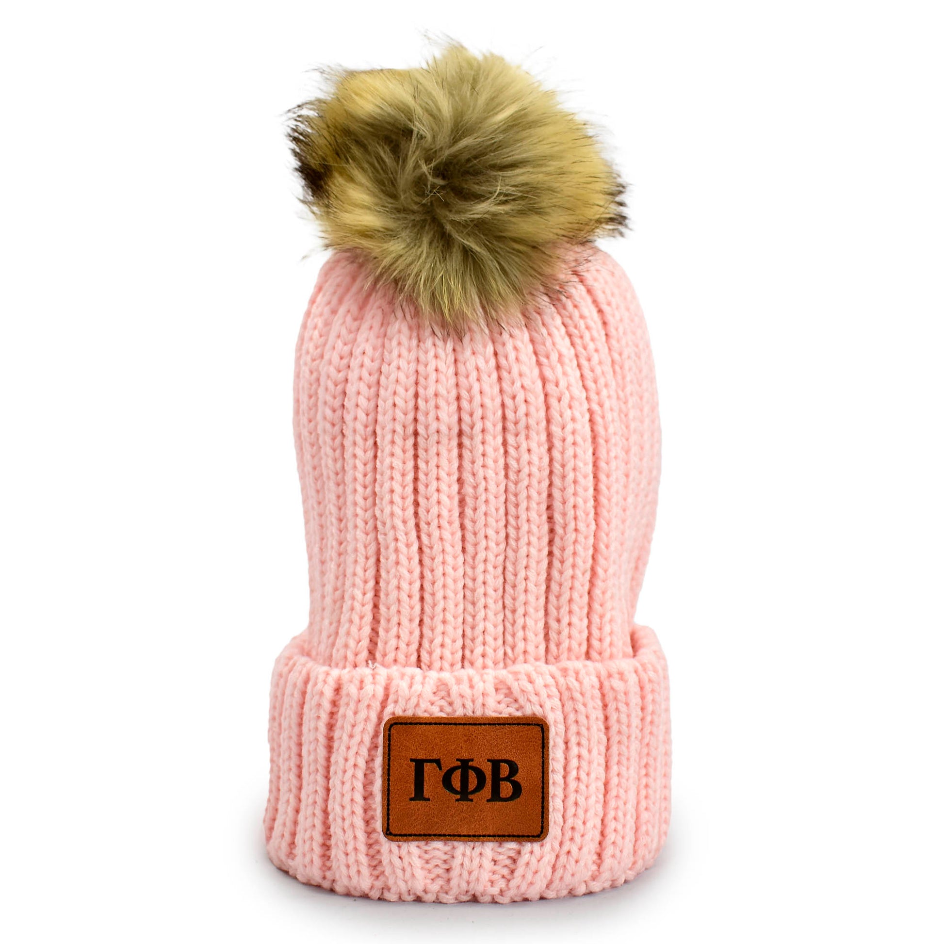 Represent in style with our Sorority Pom Pom Beanie Hat! Our knit hat is color specific to your organization and features a vegan leather patch embossed with your sorority letters. The super fluffy fur pom pom on top makes it the perfect trendy accessory to show off your spirit during the fall and winter months!
