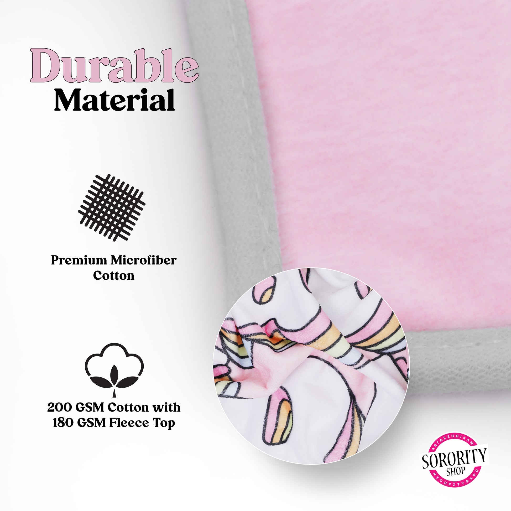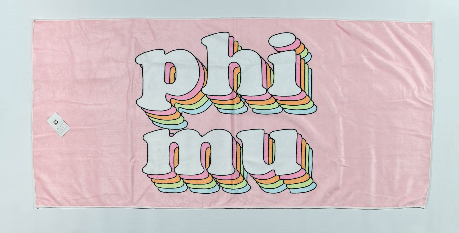 Show your Phi Mu Sorority pride at the beach, pool, or just around the dorm with these full color, microfiber sorority towels/blankets. Perfect for a new member gift, bid day, big little, or just for Summer!