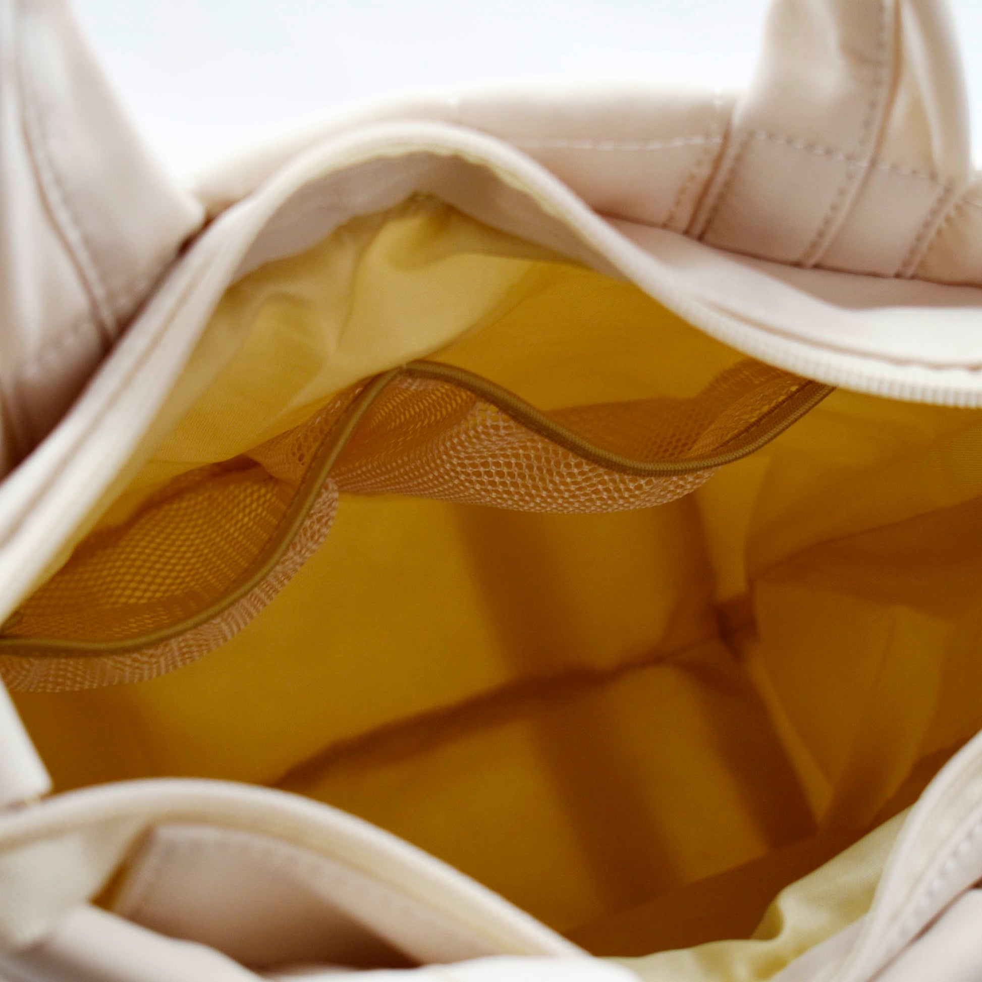 - COOL AND CASUAL BAG DESIGNED WITH DETAILS IN MIND: The quilted tote features an attractive ivory-color polyester outer layer with light gold-color metal for the sturdy zipper pulls and strap hardware. The nicely stitched square quilts reinforces an effortlessly cool look.
