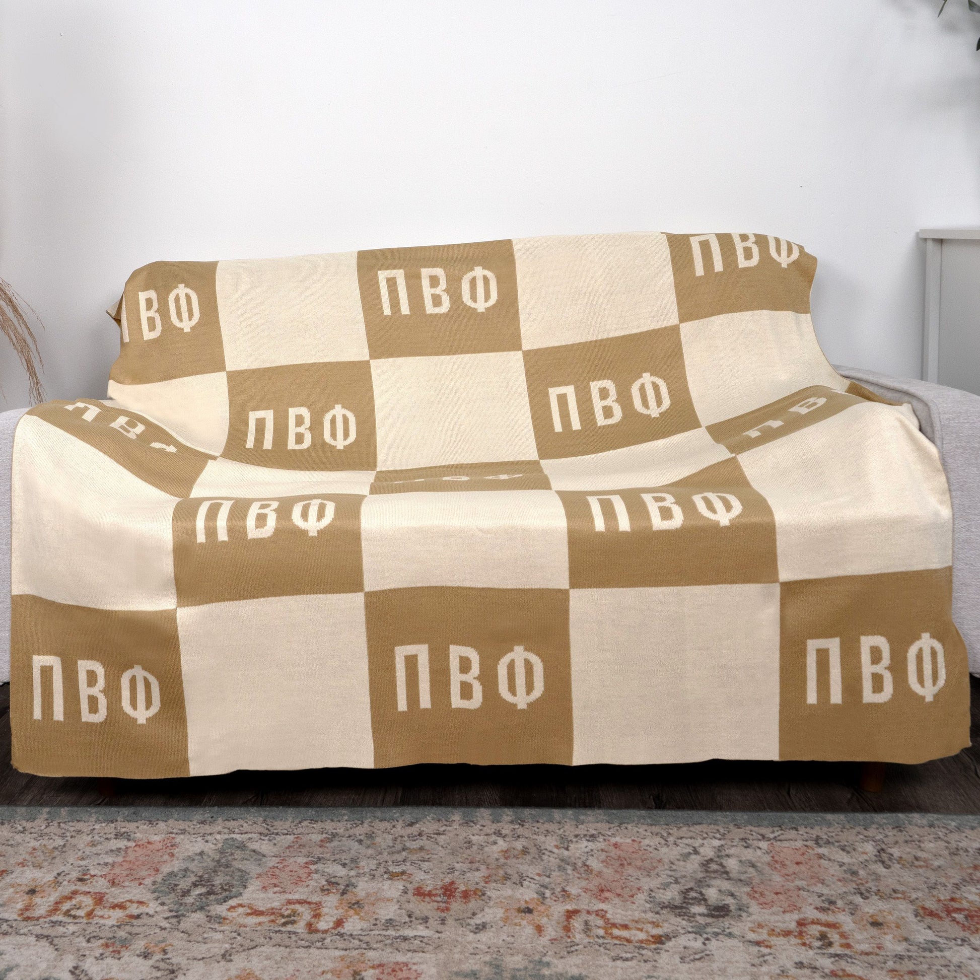 Snuggle up in style and showcase your Pi Beta Phi sisterhood with our irresistibly soft and lightweight biscotti and pearl ivory throw blanket.