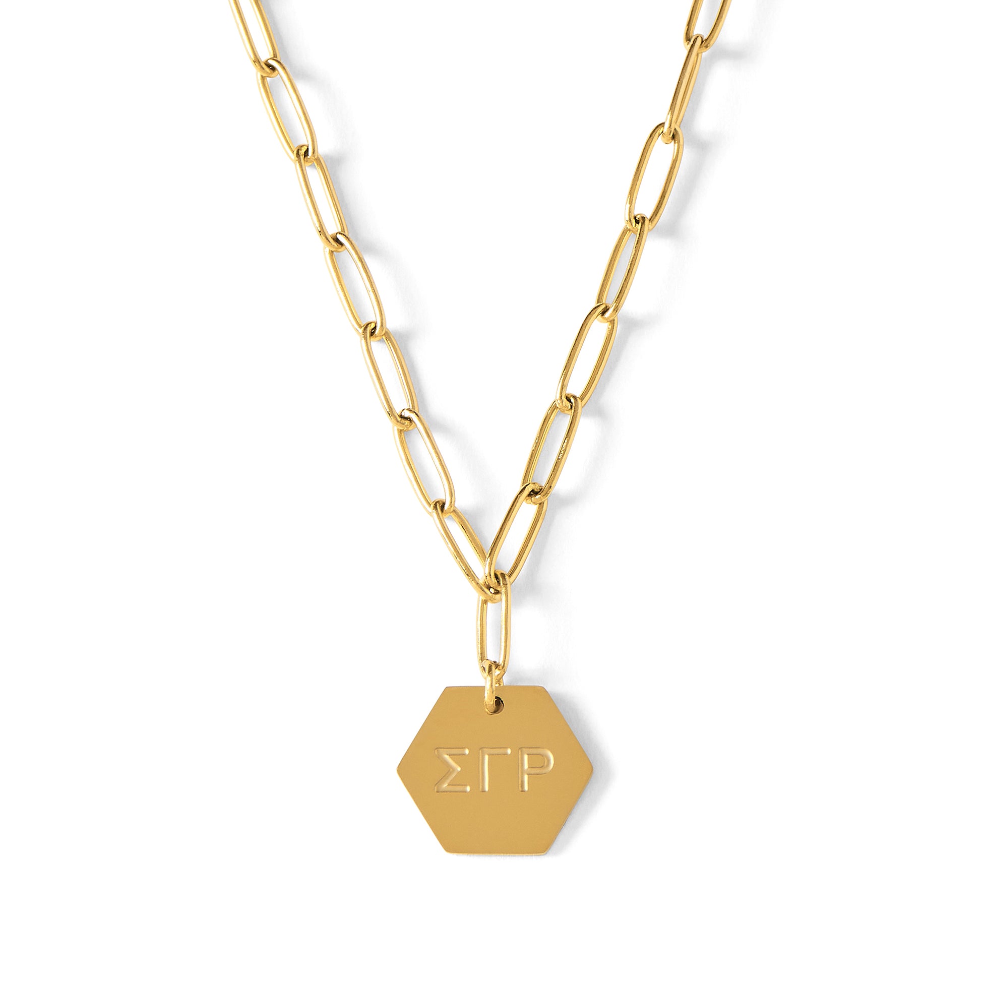 The perfect gift of Sisterhood! Our Paperclip Style Chain Sorority Necklace features your sorority's Greek letters on a 15mm hexagon shaped pendant, with a paperclip style chain, all dipped in 18K Champagne gold! Perfect for a bid day gift, big little gift or a treat for yourself!