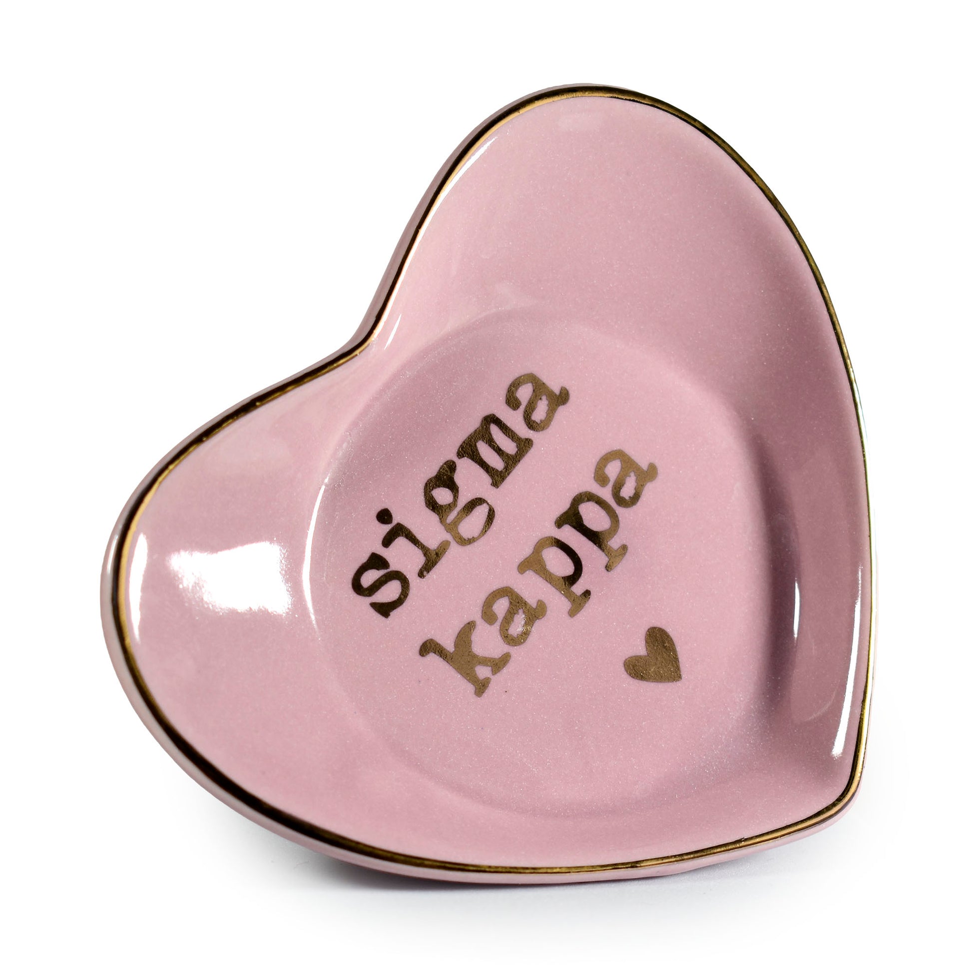 Our Sigma Kappa ceramic ring dish is the definition of chic with its high gloss finish and sorority name, heart and edge in gold. Great for rings, jewelry, keys or trinkets. Perfect for home or office!