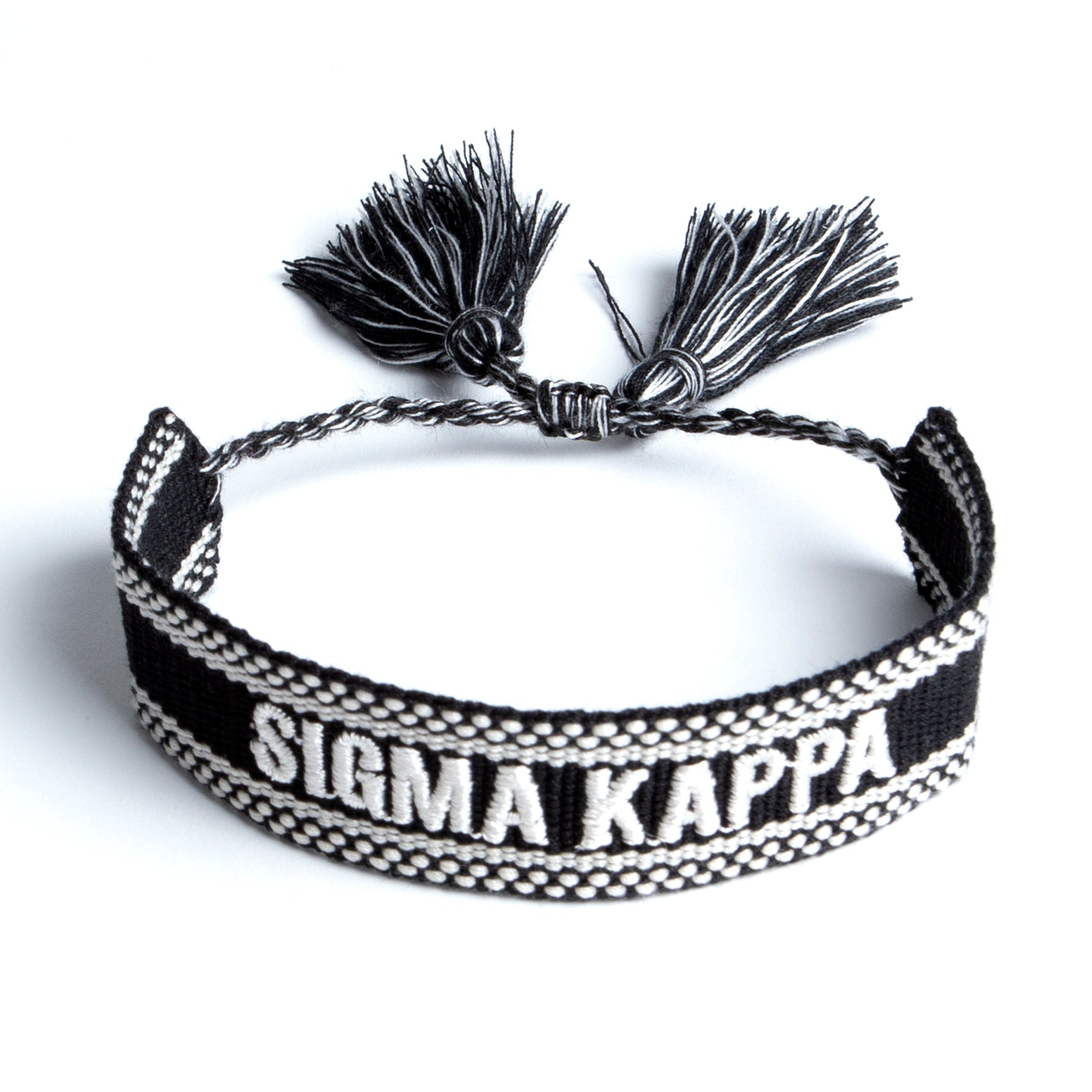 What sister doesn't want to represent her sorority in style? Modeled after your favorite designer bracelet, represent your sorority with our embroidered name bracelet. Our bracelet is one size fits all with adjustable sizing and is available in two different colors- black and white and gold and white!