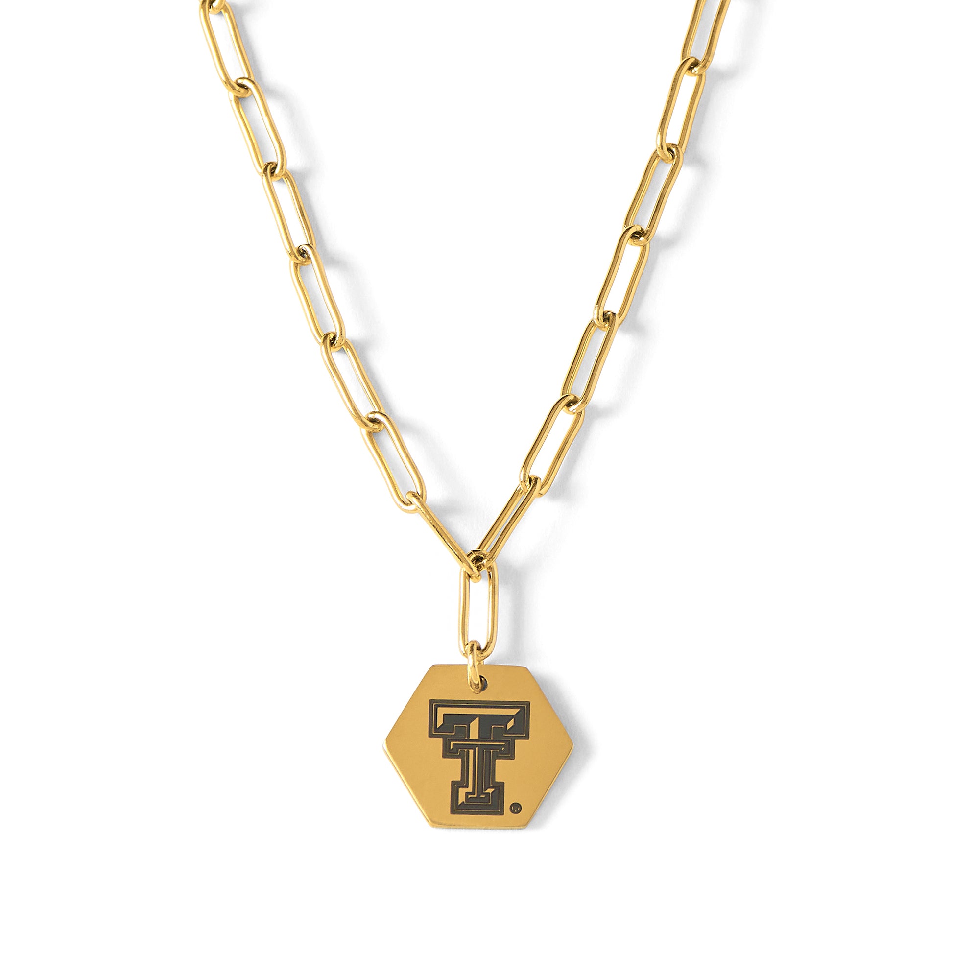 Our Texas Tech University Necklace features your Texas Tech logo on a 15mm hexagon shaped pendant, with a paperclip style chain, all dipped in 18K Champagne gold!